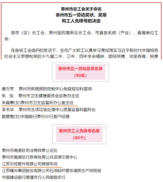 4月28日,泰州市總工會發布《關于命名泰州市五一勞動獎狀、獎章和工人先鋒號的決定》,對各行各業涌現出的一批先進集體和個人進行命名表彰。其中,民建泰州市委科教文衛委員會主任、泰州市衛生監督所辦公室主任朱霞惠榮獲“泰州市五一勞動獎章”,民建會員企業江蘇貝特管件有限公司焊接車間榮獲“泰州市工人先鋒號”。