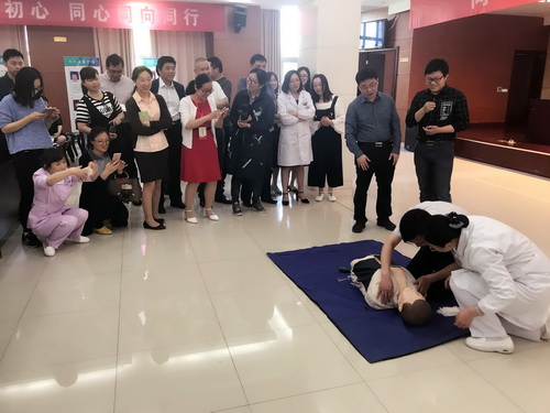 “同心圓夢?醫療服務團”的護理人員配合郭博士的講解,現場進行了急救演練。現場參加活動人員對參與急救練習熱情度很高,部分人員現場進行了心肺復蘇練習,并表示受益匪淺。