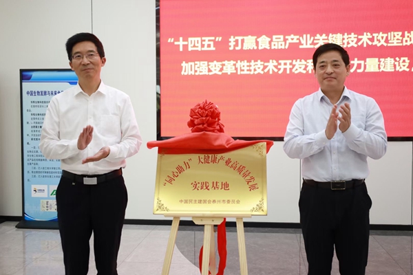 在中國生物發酵與未來食品產業研究院,卞賦章、陸國富共同為民建泰州市委員會“同心助力”大健康產業高質量發展實踐基地揭牌。卞賦章希望民建組織和廣大會員以基地揭牌為契機,不斷增強助推高質量發展的思想自覺和行動自覺,充分發揮資源優勢和人才優勢,主動擔當作為,積極履職盡責,協同推進大健康產業高質量發展、鄉村文化產業振興實踐基地建設,督研集合、群策群力,積極助力泰興市及黃橋鎮發展優勢特色產業,推進鄉村產業振興。