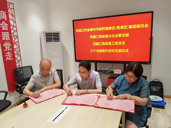 座談會上,民建江西省直工貿總支部主委李光榮、民建江西省女企業家支部主委胡慎為、民建泰州醫藥高新區(高港區)基層委員會委員、三支部主委王祖奎分別就支部制度建設、組織建設、參政議政、學習宣傳、社會服務等方面工作進行了交流,表達了互相學習、互相幫助、共同提高的愿望。隨后,在與會人員見證下,三方負責人共同簽訂了《友好共建協議書》,約定今后將以“優勢互補、互利共贏、共同提高”為目標,通過定期互訪、交流學習、共享信息等形式,積極豐富共建內容、履行共建分工、承擔共建責任,在互學互建中促進支部共同發展。