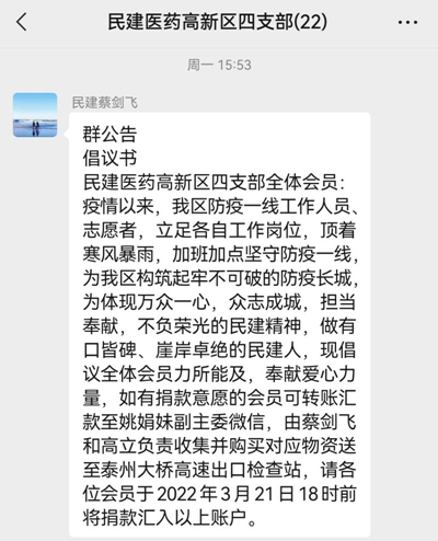 “疫情是一次考驗,大家并肩承受;疫情是一場硬仗,大家攜手作戰。”民建泰州醫藥高新區(高港區)基層委員會廣大會員不忘思源初心,凝聚點滴愛心,為合力筑牢防疫堡壘貢獻民建力量。